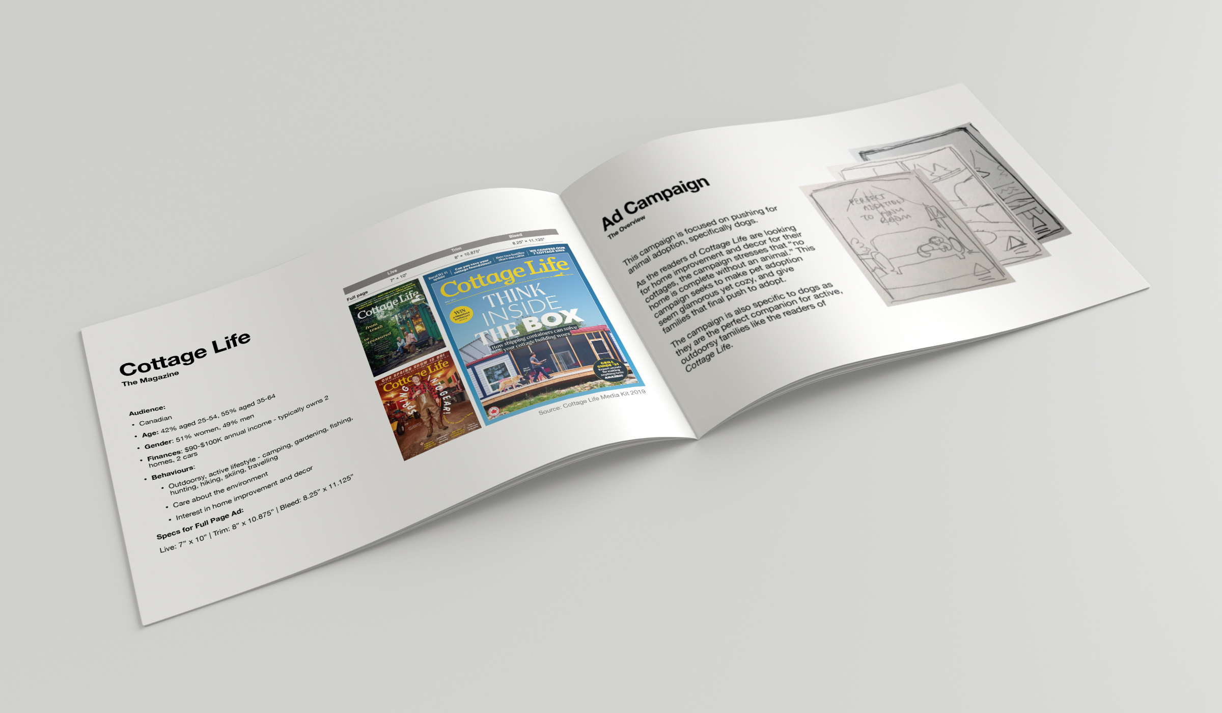 This ad campaign was conceived for Humane Canada to promote pet adoption across their partner humane societies nationwide. The campaign was designed for Cottage Living, an outdoor lifestyle magazine distributed across Canada, running as a series of three ads across three consecutive issues with the goal of increasing adoption rates. A complementary Meta social media campaign was also developed, given that the magazine's readership skews heavily toward Facebook.